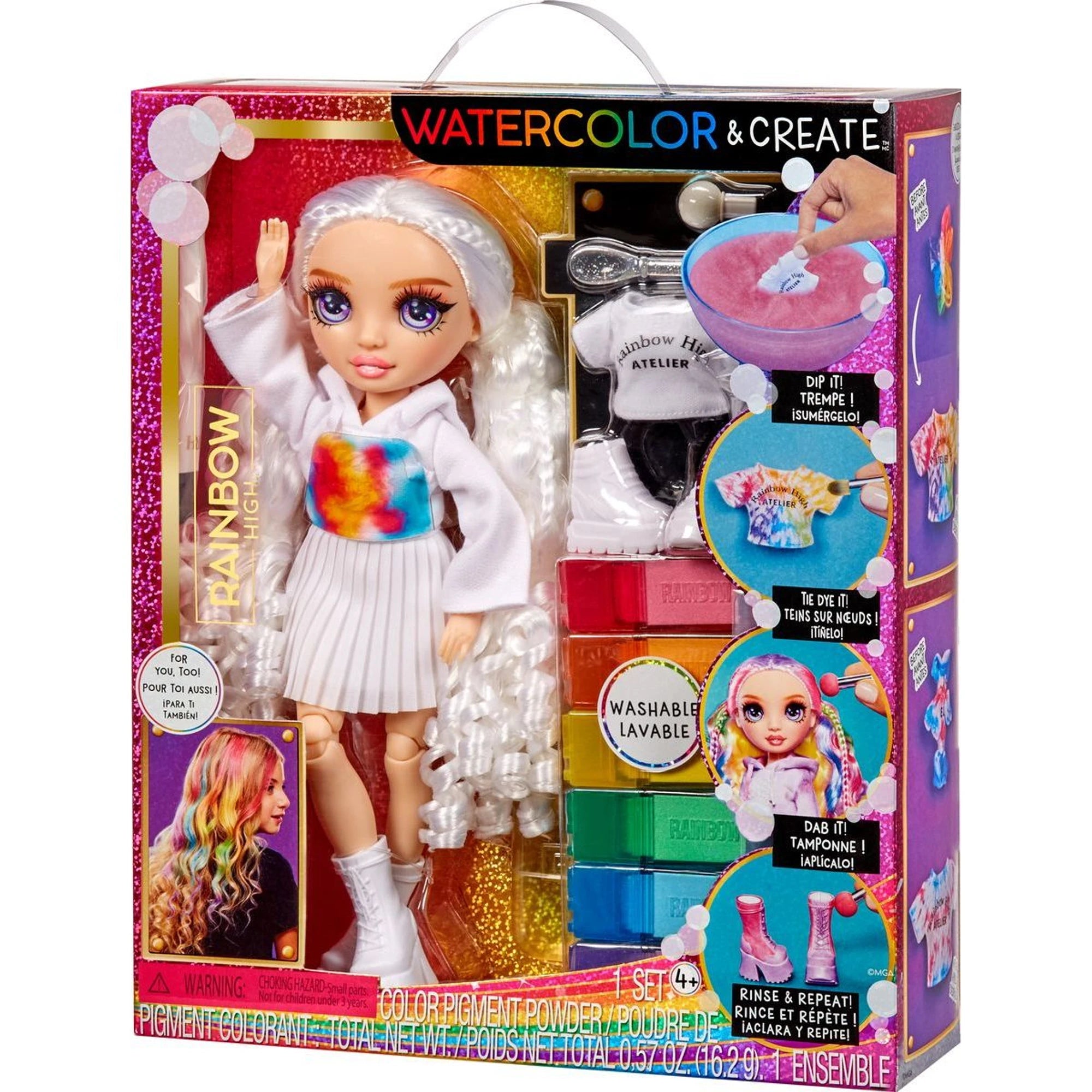 Lalki WaterColor startują z białymi włosami i ubrane są od stóp do głów na biało. Po pokolorowaniu dziewczynki mogą się lalką bawić, postawić ją na półce, a gdy przyjdzie ochota na zmianę koloru włosów i ubrania – wystarczy ją opłukać i zafarbować na nowo, zupełnie inaczej.
